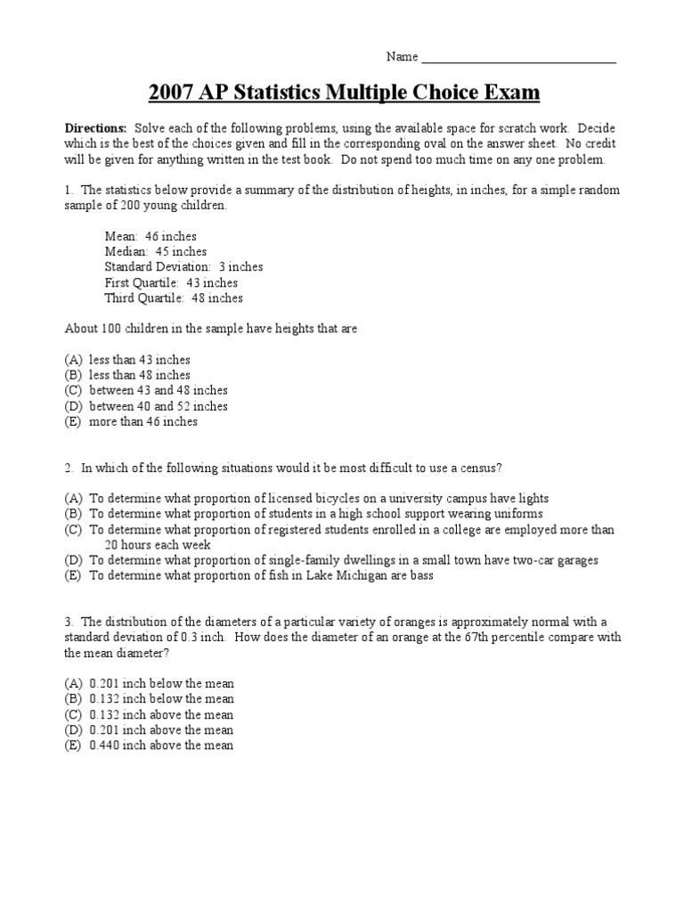 2007 AP Statistics Multiple Choice Exam PDF Confidence Interval