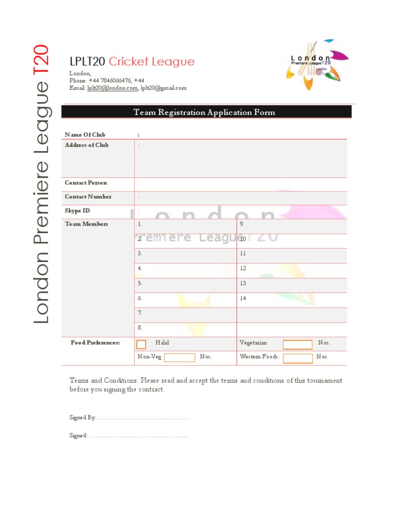 Application forms LPLT20 Cricket League Cricket Payments