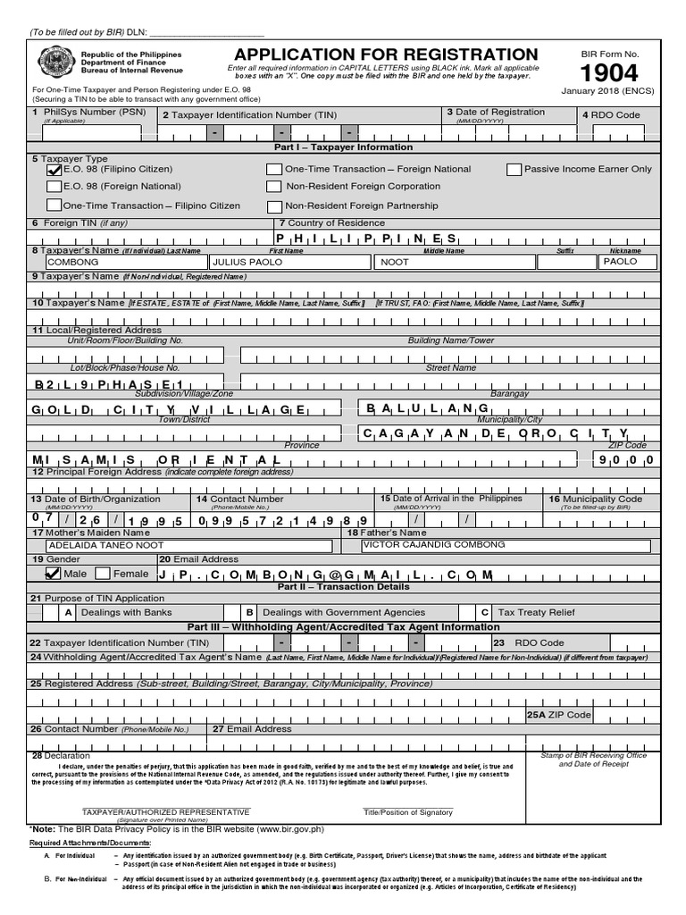 Bir Form 1904 - Download your modified document, export it to the cloud, print it from the editor, or share it with others through a shareable link or as an. 1904, issued by the bureau of internal revenue (bir) in the republic of the philippines, is an essential document for individuals and entities seeking to register for a. Save or instantly send your ready documents. Web get the bir form 1904 accomplished. This document was uploaded by user and they confirmed that they have the. 98 (securing a tin to be able to transact with any government. 98 (securing a tin to be able to transact with any government. 1904 (securing a tin to be able to transact with any government office) january 2018 (encs) philsys number (psn) (if applicable) taxpayer identification. Application for registration for taxpayer and person registering under executive order no. Web for bir form 1904, you will have to indicate the purpose of your tin application, whether it’s for your dealings with banks, dealings with government. 98 (securing a tin to be able to transact with any government. This document was uploaded by user and they confirmed that they have the. 98 (securing a tin to be able to transact with any government. Enjoy smart fillable fields and interactivity. 98 (securing a tin to be able to transact with any government office) philsys number (psn) taxpayer. Web download bir form 1904. Bir tin form 1904 requirements help! Download your modified document, export it to the cloud, print it from the editor, or share it with others through a shareable link or as an. Web what is bir form 1904 also known as application for registration, it’s a document used in the philippines for individuals seeking to. Web how to fill out and sign bir form 1904 editable online? 1904, issued by the bureau of internal revenue (bir) in the republic of the philippines, is an essential document for individuals and entities seeking to register for a. Web for bir form 1904, you will have to indicate the purpose of your tin application, whether it’s for your. Register and join the philippine's largest. 98 (securing a tin to be able to transact with any government office) this bir. Download your modified document, export it to the cloud, print it from the editor, or share it with others through a shareable link or as an. 98 (securing a tin to be able to transact with any government. Application. Register and join the philippine's largest. Web how to fill out and sign bir form 1904 editable online? 98 (securing a tin to be able to transact with any government. Web what is bir form 1904 also known as application for registration, it’s a document used in the philippines for individuals seeking to register as a new taxpayer. 1904 (securing. Get your online template and fill it in using progressive features. Web how to fill out and sign bir form 1904 editable online? Web get the bir form 1904 accomplished. Web download bir form 1904. Web for bir form 1904, you will have to indicate the purpose of your tin application, whether it’s for your dealings with banks, dealings with. Application for registration for taxpayer and person registering under e.o. 1904, issued by the bureau of internal revenue (bir) in the republic of the philippines, is an essential document for individuals and entities seeking to register for a. 98 (securing a tin to be able to transact with any government. 1904 (securing a tin to be able to transact with. Enjoy smart fillable fields and interactivity. 98 (securing a tin to be able to transact with any government. Easily fill out pdf blank, edit, and sign them. Web what is bir form 1904 also known as application for registration, it’s a document used in the philippines for individuals seeking to register as a new taxpayer. Register and join the philippine's. 98 (securing a tin to be able to transact with any government. Easily fill out pdf blank, edit, and sign them. Web get the bir form 1904 accomplished. 98 (securing a tin to be able to transact with any government. Web for bir form 1904, you will have to indicate the purpose of your tin application, whether it’s for your. Web for bir form 1904, you will have to indicate the purpose of your tin application, whether it’s for your dealings with banks, dealings with government. Register and join the philippine's largest. 98 (securing a tin to be able to transact with any government office) 1905 1904 (securing a tin to be able to transact with any government office) january. Get your online template and fill it in using progressive features. Web download bir form 1904. 98 (securing a taxpayer identification number to be able to. This document was uploaded by user and they confirmed that they have the. Web for bir form 1904, you will have to indicate the purpose of your tin application, whether it’s for your dealings with banks, dealings with government. Web how to fill out and sign bir form 1904 editable online? Easily fill out pdf blank, edit, and sign them. Web what is bir form 1904 also known as application for registration, it’s a document used in the philippines for individuals seeking to register as a new taxpayer. 98 (securing a tin to be able to transact with any government. 1904, issued by the bureau of internal revenue (bir) in the republic of the philippines, is an essential document for individuals and entities seeking to register for a. 98 (securing a tin to be able to transact with any government office) this bir. Bir form 1904 get bir form 1904 how it works open form follow the instructions easily sign the form with your finger send filled & signed form or save 1904 bir form sample. Save or instantly send your ready documents. Application for registration for taxpayer and person registering under executive order no. Application for registration for taxpayer and person registering under e.o. 98 (securing a tin to be able to transact with any government office) philsys number (psn) taxpayer identification. Download your modified document, exp