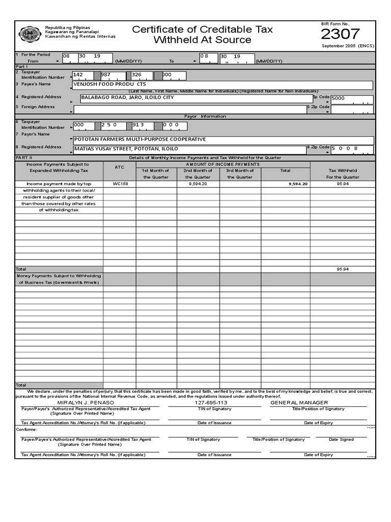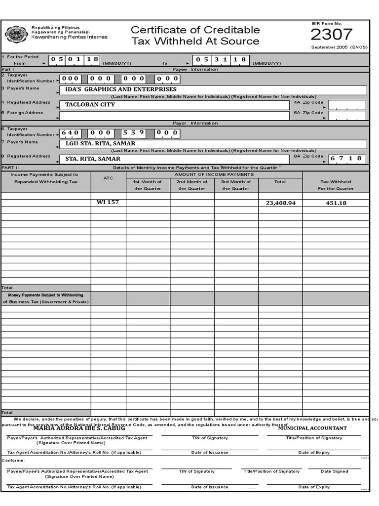 Bir Form 2307 Sample Withholding Tax Corporate Tax