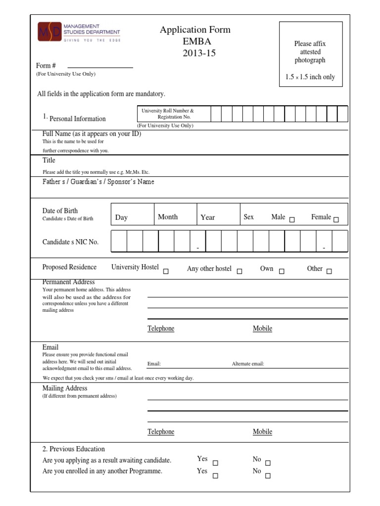 EMBA Application Form MSD 1315 PDF University And College Admission