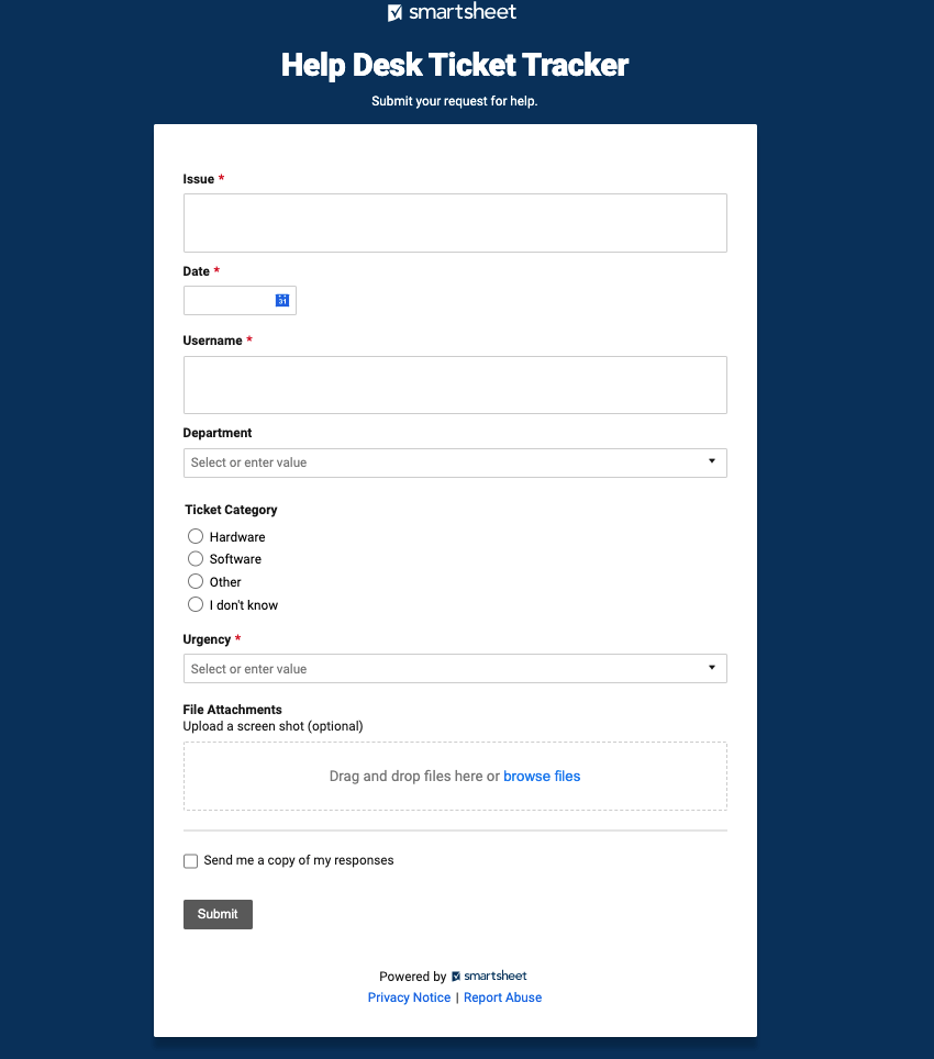 Create A Form In Smartsheet - Once you have clicked this option, proceed by. Web download return order form. Web choose whether new form submissions are added to the top or bottom of your sheet from the settings tab. Select form > manage forms. Web who can use this capability? I'll show you how to create a form in smartsheet and some tips, tricks, and suggestions along the way. Web creating a test or assessment as a form kelly parker 05/15/20 i am trying to create a test / exam / assessment in ss and create a formula to auto grade. The “forms” tab will only be. Web creating a smartsheet form can be very useful fo. Web create a new form. Web web forms are specific for each sheet and each form field is tied to a column located in the sheet. Edit or remove fields in a form to start editing form fields, go to the form builder. Web open “forms” in the top left section of the app window. Web choose whether new form submissions are added to the. Web to open the form manager, select forms > manage forms from the sheet to which the form is associated. When a new form is created, all columns (except for. From the form manager, you can select any form to edit it, or you. Change the default column headers, and adjust the width of columns if necessary. Web open “forms”. Open the sheet that you want to attach the form to. Ad choose from 40+ unlocked, use case specific form templates. Manage form display and submission options. Web sign in with apple. I'll show you how to create a form in smartsheet and some tips, tricks, and suggestions along the way. Ad choose from 40+ unlocked, use case specific form templates. Find out if this capability is. You must be a licensed user to create a new sheet or other smartsheet item. We also look at how to set up the form, and how it. Web creating a smartsheet form can be very useful fo. You must be a licensed user to create a new sheet or other smartsheet item. Web creating a test or assessment as a form kelly parker 05/15/20 i am trying to create a test / exam / assessment in ss and create a formula to auto grade. Manage form display and submission options. Web download return order form. We also. Web create a new form. Forms are the unsung heroes of data gathering, be it within your organization or from the outside world. I'll show you how to create a form in smartsheet and some tips, tricks, and suggestions along the way. When a new form is created, all columns (except for. Web smartsheet forms improve how your team collects. Web creating a smartsheet form can be very useful fo. Follow along in this smartsheet form tutorial. Create a return order form that you can send to customers or allow them to download from your website. Web 18.1k subscribers 3.9k views 2 years ago smartsheet training learn how to create a form in smartsheet. Web to start the process of. Manage form display and submission options. Only the owner of an item can rename it. Web open the tables tab, click new, click insert table with headers. Start a free trial today. Choose from thousands of customizable form templates. Follow along in this smartsheet form tutorial. Web open “forms” in the top left section of the app window. Web 18.1k subscribers 3.9k views 2 years ago smartsheet training learn how to create a form in smartsheet. Web to open the form manager, select forms > manage forms from the sheet to which the form is associated. Web choose whether. Web creating a smartsheet form can be very useful fo. Follow along in this smartsheet form tutorial. Web choose whether new form submissions are added to the top or bottom of your sheet from the settings tab. Log into your smartsheet account. Web create a new form. Heyflow forms improve conversion rates & drive business. Create a return order form that you can send to customers or allow them to download from your website. Forms are the unsung heroes of data gathering, be it within your organization or from the outside world. Web open a new microsoft word document. Select form > manage forms. Choose from thousands of customizable form templates. Web open the tables tab, click new, click insert table with headers. Start a free trial today. Only the owner of an item can rename it. Change the default column headers, and adjust the width of columns if necessary. When a new form is created, all columns (except for. There currently is not a way to copy web forms between. Edit or remove fields in a form to start editing form fields, go to the form builder. Web sign in with apple. Web or drag and drop it into the exact location you want. Web create a new form. Start a free trial today. Web add form responses to smartsheet. Web who can use this capability? Manage form display and submission options.3 ways you’ll more with Smartsheet forms Smartsheet