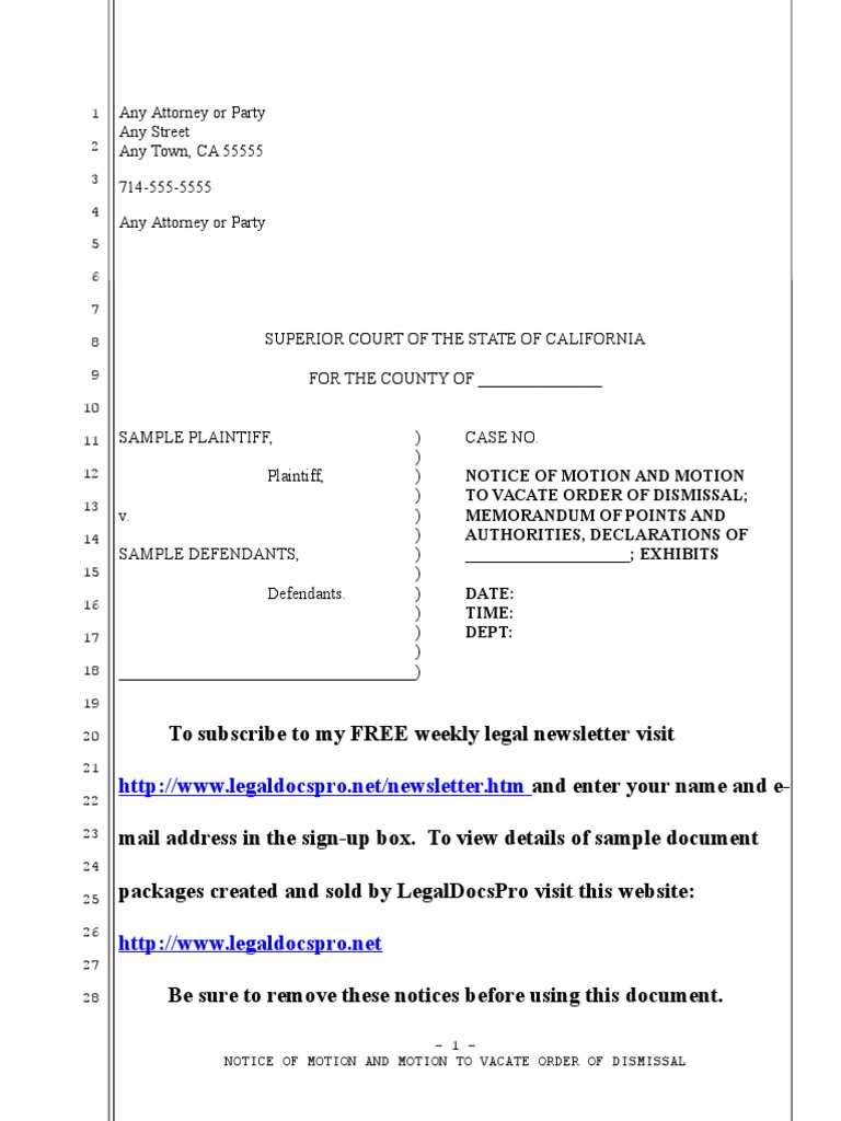 Sample Motion To Vacate Dismissal in California PDF Prejudice