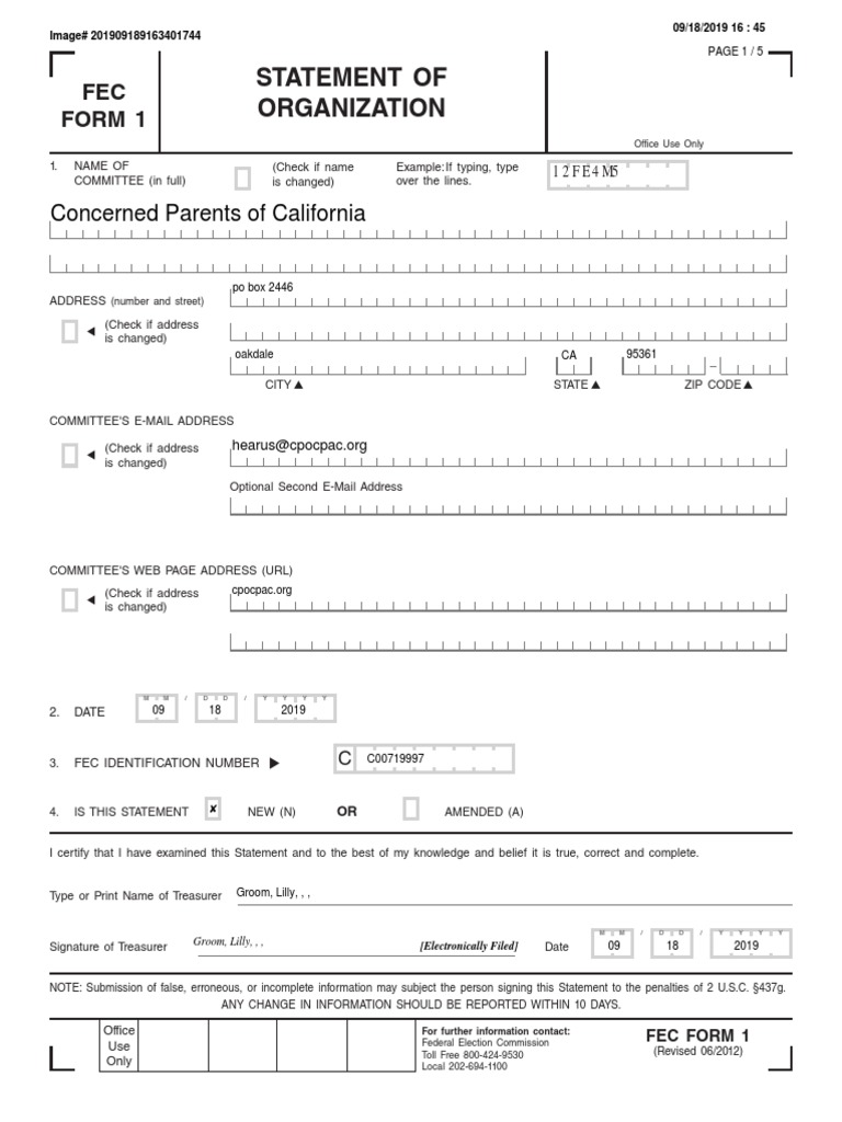 Concerned Parents of California FEC FORM 1 September 18, 2019