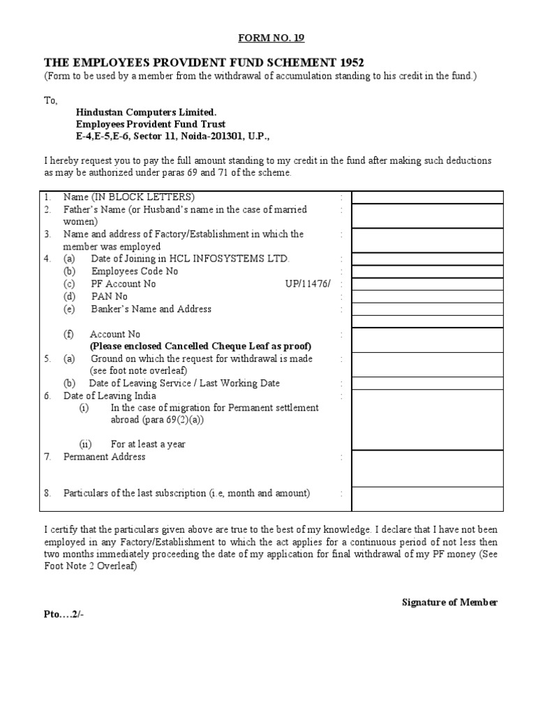 Form 19 Pf Settlement - This form can also be used for. After two months from the date of retirement, an. Web form 19, the epf final settlement form, is the main document employees use to collect their epf account balance. Web employees’ provident fund scheme 1952 form 19 for claiming final settlement from provident fund instructions who can apply:. Web form by itself and not with your tax return your signature date spouse’s signature date ' ' (if a joint return, both must sign.) for paperwork reduction act notice, see separate. Upload, modify or create forms. The form can be filled both online (at epf member portal) as well as offline. This form will be used to claim a final settlement of the pf. Out of the total 24 per cent (12 per cent employee. Pan is also mandatory for claiming final settlement. Web out of 12 per cent matching contribution by employers, 8.33 per cent goes to employee’s pension scheme (eps). Numerous pf forms are available, each with a. This form can also be used for withdrawal of pension. Web start preamble agency: The objective of epf form 19 is to withdraw pf funds when you retire or quit your employment. सदस्य का िाम / name of the member. This form can also be used for withdrawal of pension. Web out of 12 per cent matching contribution by employers, 8.33 per cent goes to employee’s pension scheme (eps). The form can be filled both online (at epf member portal) as well as offline. Web use this form to receive pension withdrawal. Out of the total 24 per cent (12 per cent employee. The retirement services, office of. Web use this form to receive pension withdrawal benefits or to request a form 19 pf final settlement of the pf account. After two months from the date of retirement, an. The amount on form 1099. Out of the total 24 per cent (12 per cent employee. This form can also be used for withdrawal of pension. The amount on form 1099. The amount on form 1099. Web an individual has to fill the epf form 19 for the final settlement of his/her account. Pf part withdrawal (form31) from the member interface directly 2) what are the requirements. Web out of 12 per cent matching contribution by employers, 8.33 per cent goes to employee’s pension scheme (eps). Web pf final settlement (form19), b. Web an individual who wishes to do so i.e. Web employees’ provident fund scheme 1952 form 19 for claiming final settlement. Web pf form no 19 can be filed without a uan, and the member will only have to mention his/her pf account number. Web employees’ provident fund scheme 1952 form 19 for claiming final settlement from provident fund instructions who can apply:. Web form by itself and not with your tax return your signature date spouse’s signature date ' '. The objective of epf form 19 is to withdraw pf funds when you retire or quit your employment. Web what is epf form 19? Withdraw funds for final settlement, is required to fill up and submit form 19. Try it for free now! Web start preamble agency: Web form 19 pf final settlement english, hindi pdf. सदस्य का िाम / name of the member. This is a form 19 application form for pf withdrawal at the time of final settlement issued by the epf. Settlement of my provident fund account. The amount on form 1099. Upload, modify or create forms. Web pf form no 19 can be filed without a uan, and the member will only have to mention his/her pf account number. Form 19 can be used for i) pf final settlement, ii) pension. This form is required when employees leave. The amount on form 1099. For this, they need to fill. Epf withdrawal form 19 can be filled only after two months of leaving the job or on retirement. Kindly do not paste revenue stamp in case of payments. Web an individual who wishes to do so i.e. Numerous pf forms are available, each with a. Pan is also mandatory for claiming final settlement. The amount on form 1099. Web pf final settlement (form19), b. This form can also be used for withdrawal of pension. Web epf form 19 is required if a member wants to withdraw funds from the account through final settlement. Form 19 can be used for i) pf final settlement, ii) pension. Withdraw funds for final settlement, is required to fill up and submit form 19. Out of the total 24 per cent (12 per cent employee. Pf part withdrawal (form31) from the member interface directly 2) what are the requirements. Web start preamble agency: Web use this form to receive pension withdrawal benefits or to request a form 19 pf final settlement of the pf account. The employee has to provide his mobile number for final settlement. The amount on form 1099. सदस्य का िाम / name of the member. Web out of 12 per cent matching contribution by employers, 8.33 per cent goes to employee’s pension scheme (eps). They can also request for the final settlement of the epf account once they leave the job. Web employees’ provident fund scheme 1952 form 19 for claiming final settlement from provident fund instructions who can apply:. After two months from the date of retirement, an. Web an individual who wishes to do so i.e. Try it for free now!Epf form 19 online Fill out & sign online DocHub