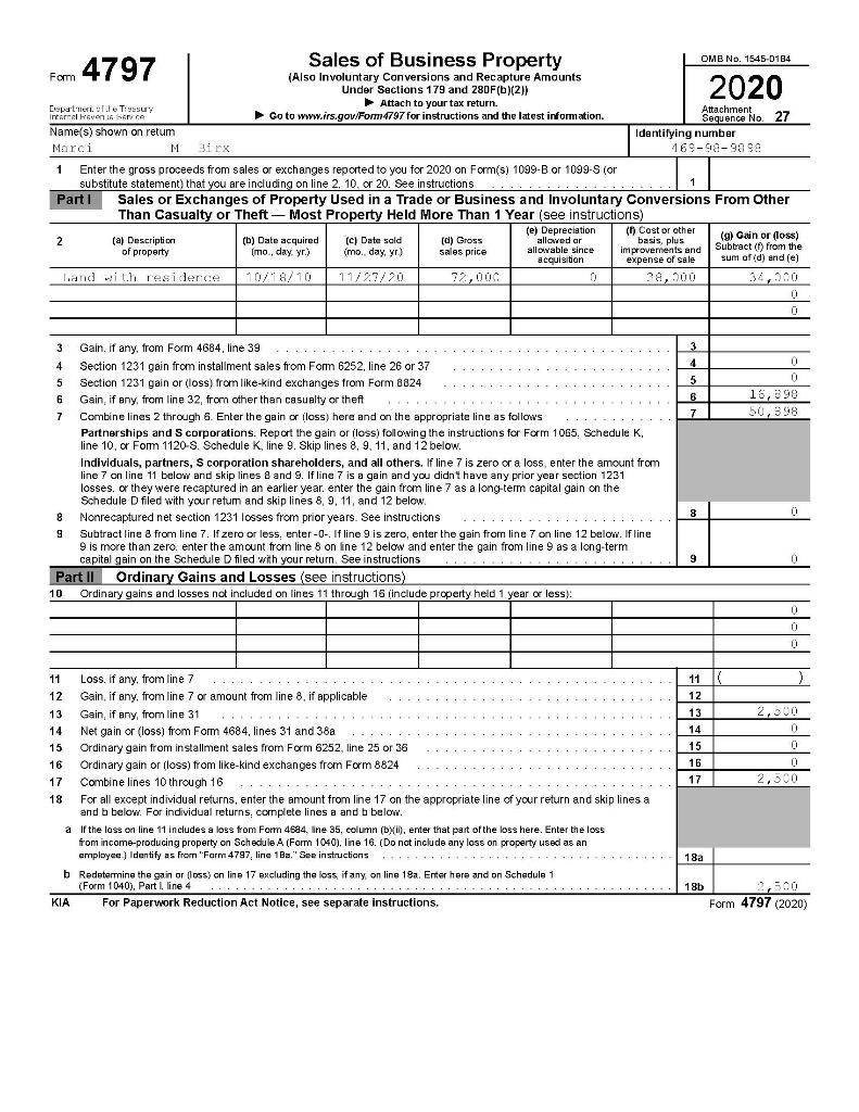Form 4797 Part 1 - (also involuntary conversions and recapture amounts. •the sale or exchange of: Web as outlined above, the irs requires business owners to use form 4797 to report the disposition of capital assets not reported on schedule d. (ii), enter that part of. Department of the treasury internal revenue service. Get ready for tax season deadlines by completing any required tax forms today. Ad signnow.com has been visited by 100k+ users in the past month Or form 8824, parts i and ii. Web form 4797, sales of business property is used to report the following transactions: Enter the name and identifying. (ii), enter that part of. Hello, i followed turbotax instructions to record the sale of a rental property under rental and royal properties section. Get ready for tax season deadlines by completing any required tax forms today. Real property used in your trade or business; Web reporting transactions on form 4797. Or form 8824, parts i and ii. (also involuntary conversions and recapture amounts. Depreciable and amortizable tangible property used in your. Web use form 4797 to report the following. First of all, you can get this form from the department of treasury or you can just download the irs form 4797 here. Web if the loss on line 11 includes a loss from form 4684, line 35, column (b)(ii), enter that part of the loss here. Property used in a trade or business. Form 4797 input for sales of business property. Real property used in your trade or business; Web form 4797, sales of business property is used to report the following. Web reporting transactions on form 4797. Solved•by intuit•15•updated 1 year ago. In 2019 turbotax, for a form 1065. Hello, i followed turbotax instructions to record the sale of a rental property under rental and royal properties section. Web form 4797 department of the treasury internal revenue service sales of business property (also involuntary conversions and recapture amounts. Property used in a trade or business. Web what is form 4797? In 2019 turbotax, for a form 1065. Depreciable and amortizable tangible property used in your. Enter the name and identifying. Enter the name and identifying. Hello, i followed turbotax instructions to record the sale of a rental property under rental and royal properties section. Web complete form 4797, line 19, columns (a), (b), and (c); Depreciable and amortizable tangible property used in your. Web form 4797 department of the treasury internal revenue service sales of business property (also involuntary conversions. Complete, edit or print tax forms instantly. Web i have a k1 with required entries for form 4797 part ii line 10 and form 6251 line 17. Or form 8824, parts i and ii. Web as outlined above, the irs requires business owners to use form 4797 to report the disposition of capital assets not reported on schedule d. Sales. Form 4797 is a tax form required to be filed with the internal revenue service (irs) for any gains realized from the sale or transfer of. Department of the treasury internal revenue service. Form 4797 input for sales of business property. Solved•by intuit•15•updated 1 year ago. In 2019 turbotax, for a form 1065. Enter the name and identifying. Property used in a trade or business. Department of the treasury internal revenue service. Form 4797 is a tax form required to be filed with the internal revenue service (irs) for any gains realized from the sale or transfer of. First of all, you can get this form from the department of treasury or you. Solved•by intuit•15•updated 1 year ago. Enter the amount in ordinary gain (loss) to. Department of the treasury internal revenue service. Web what is form 4797? Form 4797 input for sales of business property. Form 4797 input for sales of business property. Depreciable and amortizable tangible property used in your. Web complete form 4797, line 19, columns (a), (b), and (c); (ii), enter that part of. Web reporting transactions on form 4797. Web i have a k1 with required entries for form 4797 part ii line 10 and form 6251 line 17. Web use form 4797 to report the following. Solved•by intuit•15•updated 1 year ago. Real property used in your trade or business; Enter the amount in ordinary gain (loss) to. Form 4797 is a tax form required to be filed with the internal revenue service (irs) for any gains realized from the sale or transfer of. Report the amount from line 1 above on form 4797, line 20;. Web form 4797 department of the treasury internal revenue service sales of business property (also involuntary conversions and recapture amounts. Ad signnow.com has been visited by 100k+ users in the past month Enter the name and identifying. First of all, you can get this form from the department of treasury or you can just download the irs form 4797 here. Or property was sold at a loss. Form 6252, lines 1 through 4; Report sales/exchanges of property held > 1 year when depreciation was not allowed/allowable. Department of the treasury internal revenue service.Form 4797 Fill Out and Sign Printable PDF Template signNow