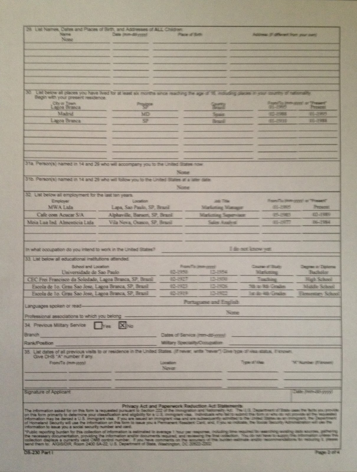 Immigrant Visa Application Form DS 230 Social Security Number
