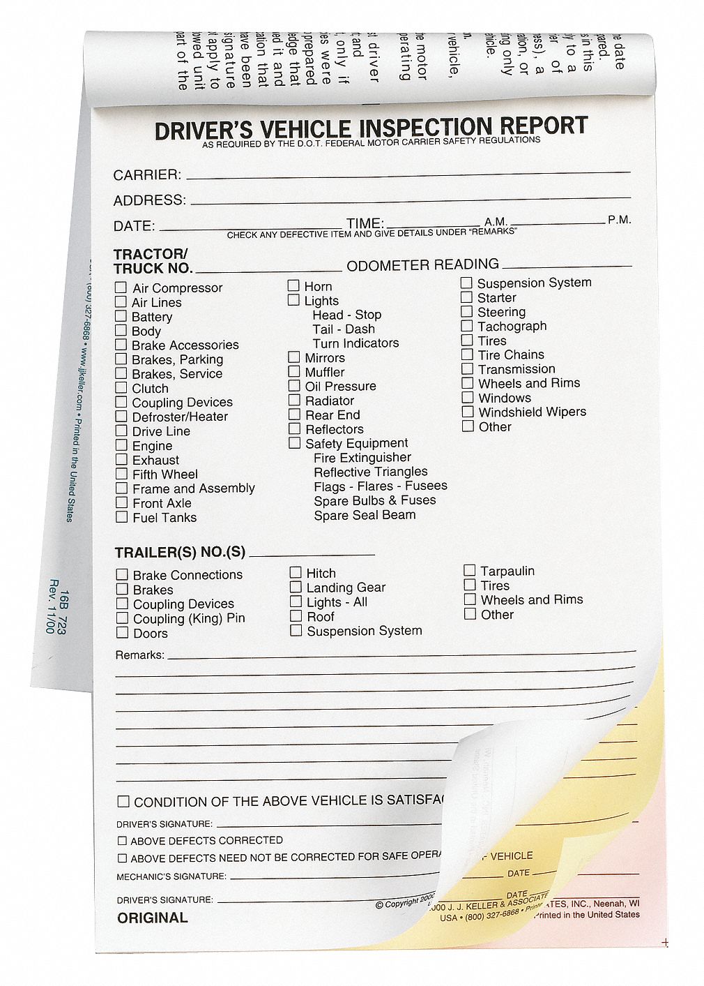 JJ KELLER Vehicle Inspection Form,3 Ply,W/Carbon 38D296723 Grainger