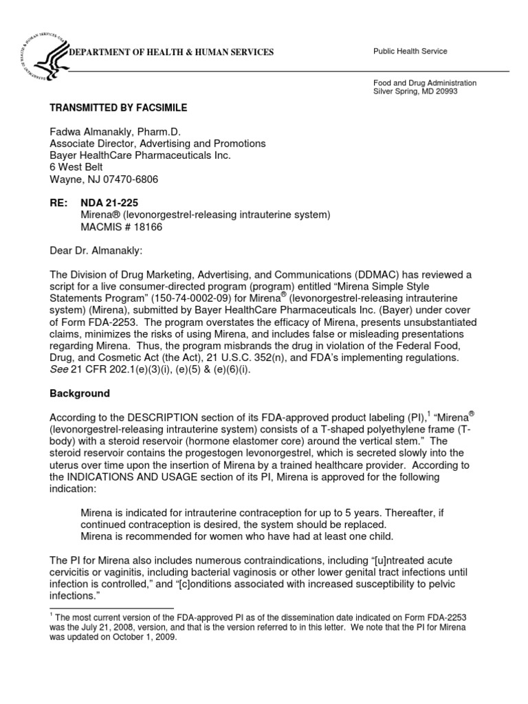 Mirena Warning Letter From Department of Health To Bayer, Challenging
