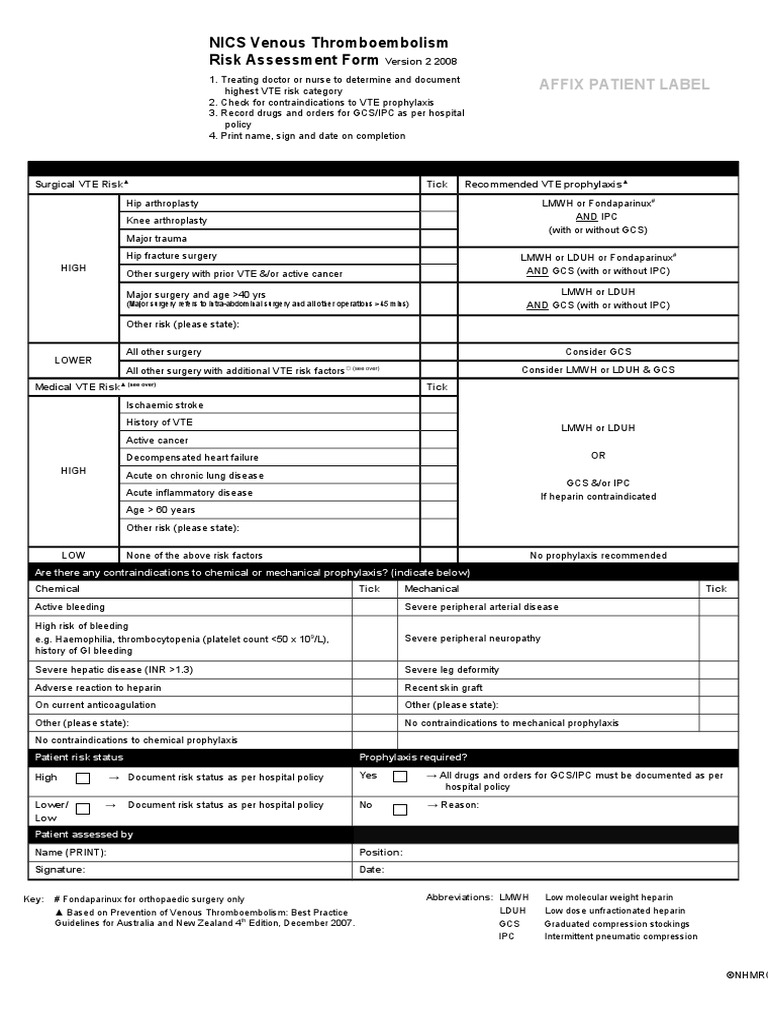2008 NICS VTE Risk Assessment Form v2 Thrombosis Clinical Medicine