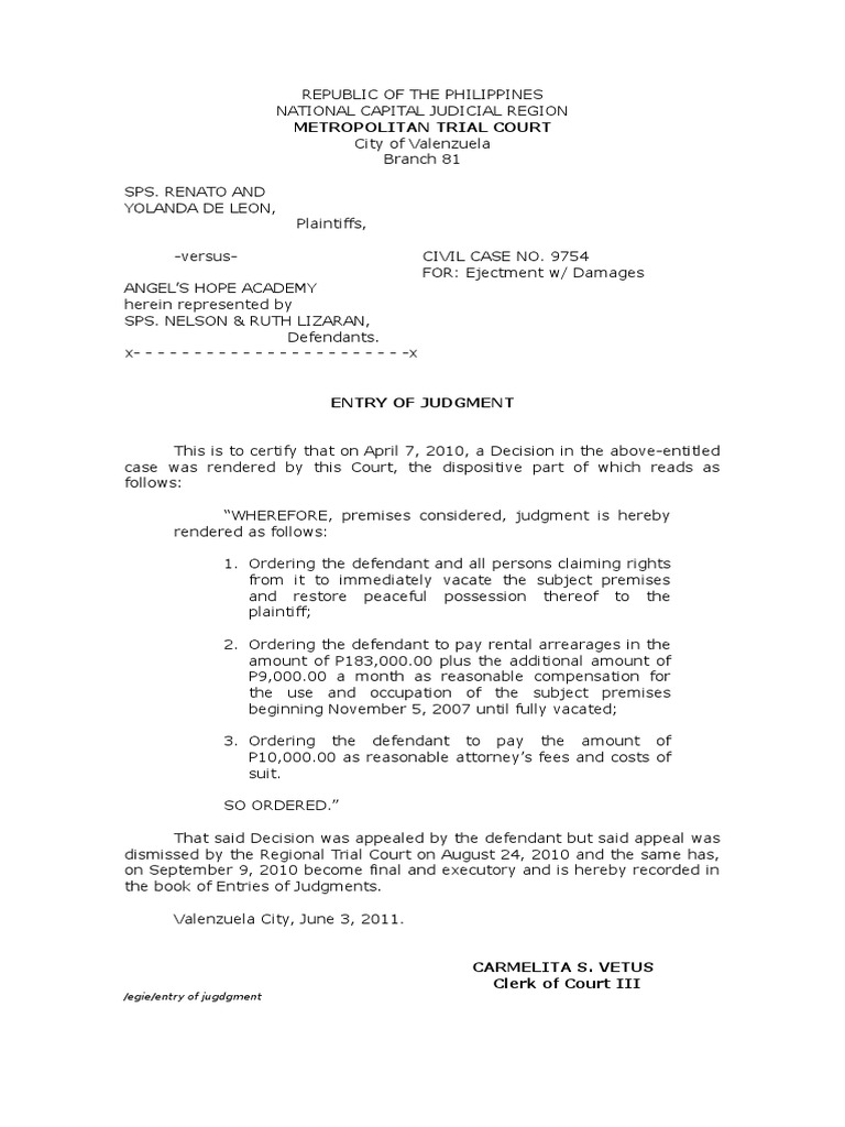 Entry of Judgment Lawsuit Judgment (Law)