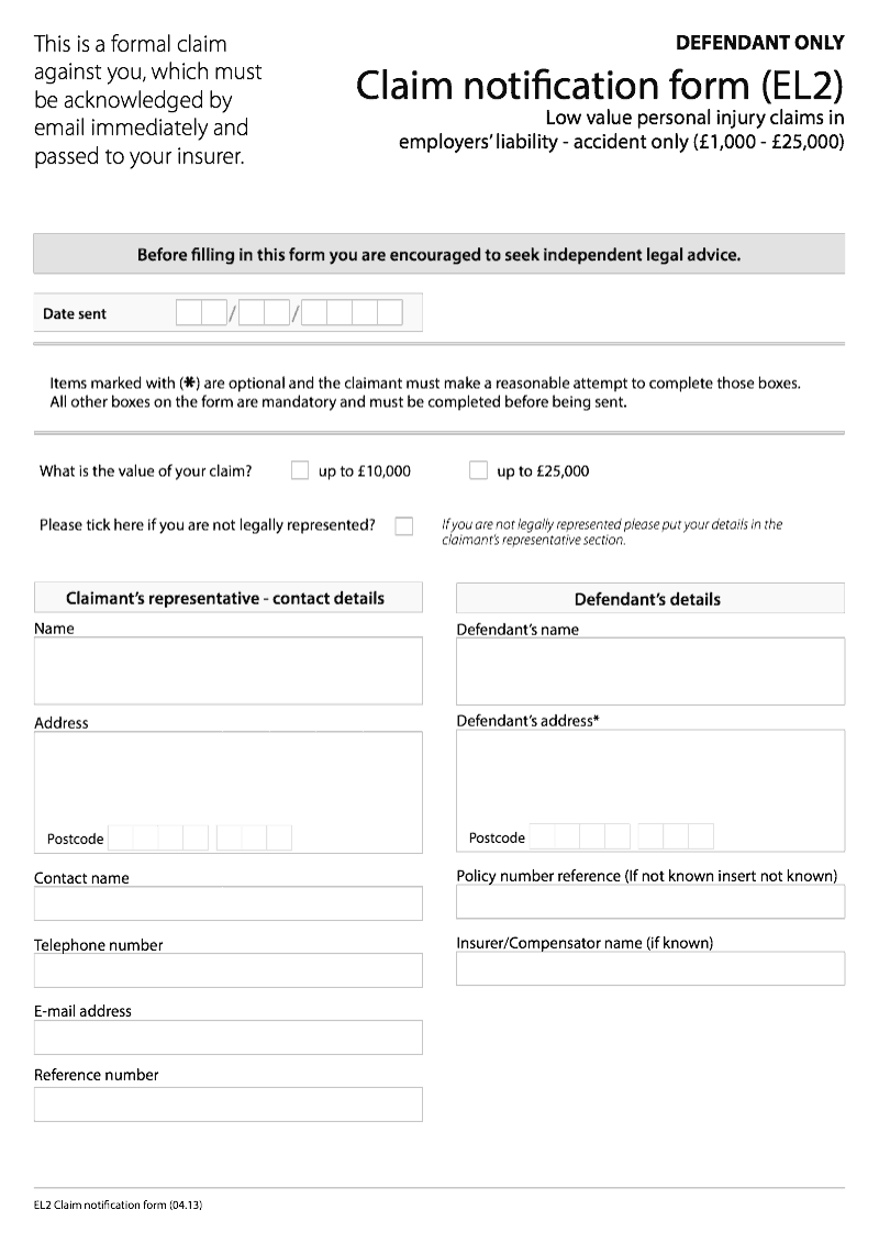 EL2 Claim notification form (EL2) Low value personal injury claims in