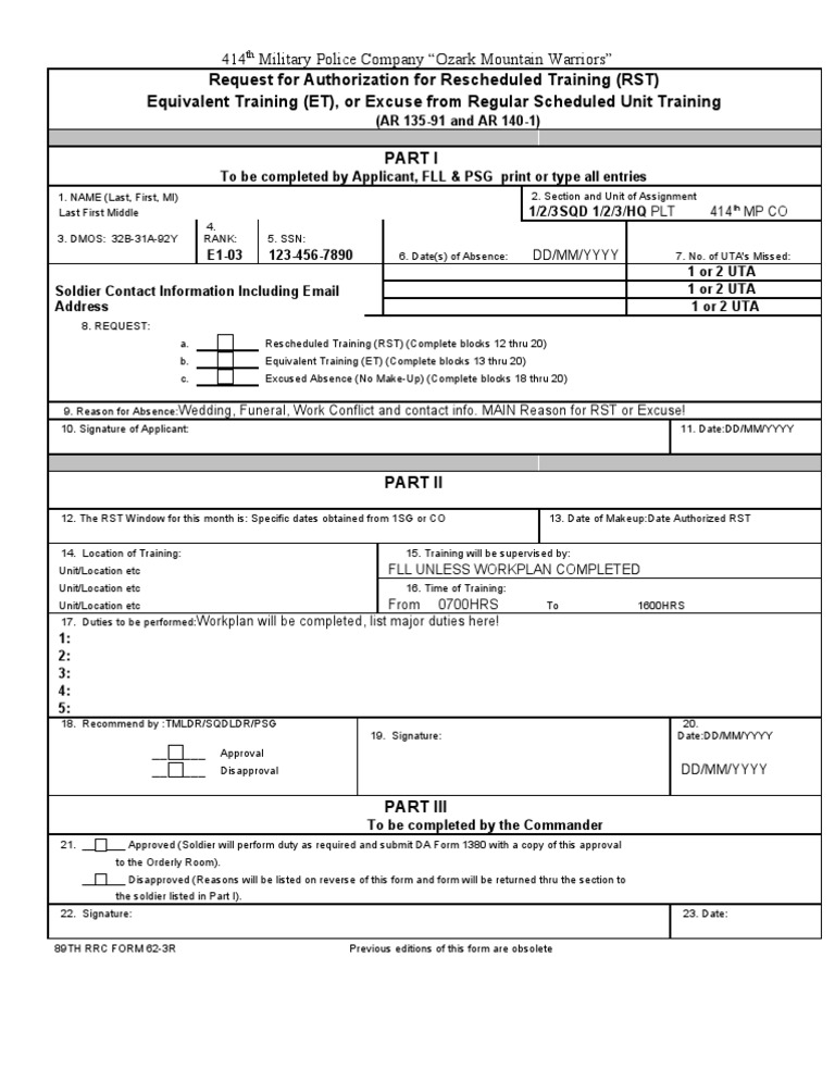 Rst Army Form - Web your request for rescheduled training (rst), excused absence, or exception to unexcused absence is: Enter your official contact and identification details. I know i have to fill out a form which i already have. Web da form 5960 to start basic allowance for housing (bah). Physical profile record (distributed by proponent, see footnotes) tsg: The latest technologies high quality electronic pubs and forms view. Ensure that the details you. Web authority for collection of personal information is 10 usc 3012 and 44 usc 3101. 10 usc § 3012 and 44 usc § 3101. Web request for absence and rescheduled training. Get valuable career training and become a leader in the army The latest technologies high quality electronic pubs and forms view. Web request for authorization for rescheduled training (rst) equivalent training (et), or excuse from regular scheduled unit training. Although filling and signing forms in ink is acceptable, soldiers and first line. The only authorized version of the. Edit, sign and save 338th army band form. _____ approved (soldier will perform duty as. Web authority for collection of personal information is 10 usc 3012 and 44 usc 3101. Web army reserve 1. The latest technologies high quality electronic pubs and forms view. Web soldiers and first line leaders will use the standard form when requesting rst. Da form 1380, may 2019 created date:. Web hi i'm new to the army reserves. Web request for continued service in the regular army: Below you can get an idea about how to edit and complete a. The latest technologies high quality electronic pubs and forms view. Web request for absence and rescheduled training. _____ approved (soldier will perform duty as. The only authorized version of the. I cannot make it to drill so i wanted to know how the rst process works. Ensure that the details you. The latest technologies high quality electronic pubs and forms view. Web click the orange get form button to begin enhancing. Physical profile record (distributed by proponent, see footnotes) tsg: Military forms & more fillable forms, register and subscribe now! Open form follow the instructions. _____ approved (soldier will perform duty as. Activate the wizard mode in the top toolbar to acquire additional tips. Whether you are just starting out or have been working out for years, this. Easily fill out pdf blank, edit, and sign them. Get valuable career training and become a leader in the army Ensure that the details you. Web authority for collection of personal information is 10 usc 3012 and 44 usc 3101. Edit, sign and save rescheduled training req form. Web army da administrative publications and forms by the army publishing directorate apd. I know i have to fill out a form which i already have. The only authorized version of the. Web army reserve 1. Web rst form army is an important step in the right direction for those looking to improve their overall fitness. Web the rst window for this month is: Web rst form army is an important step in the right direction for those looking to improve their overall fitness. Web authority for collection of personal information is 10 usc 3012 and 44 usc 3101. Activate the wizard mode in the top toolbar to acquire additional tips. Web request for absence and rescheduled training. Web army da administrative publications and. Da form 1380, may 2019 created date:. Fill out each fillable area. Web rst form army is an important step in the right direction for those looking to improve their overall fitness. Web army da administrative publications and forms by the army publishing directorate apd. Web authority for collection of personal information is 10 usc 3012 and 44 usc 3101. Edit, sign and save rescheduled training req form. Open form follow the instructions. Enter your official contact and identification details. Web rst form army is an important step in the right direction for those looking to improve their overall fitness. Web click the orange get form button to begin enhancing. Ensure that the details you. Get valuable career training and become a leader in the army Da form 1380, may 2019 created date:. Web request for authorization for rescheduled training (rst) equivalent training (et), or excuse from regular scheduled unit training. Web army da administrative publications and forms by the army publishing directorate apd. Web da form 5960 to start basic allowance for housing (bah). Web soldiers and first line leaders will use the standard form when requesting rst. Web army reserve 1. Please use the following links to ensure you download the latest versions of the applicable forms. Web authority for collection of personal information is 10 usc 3012 and 44 usc 3101. Web hi i'm new to the army reserves. Rescheduled training form army reserve. Although filling and signing forms in ink is acceptable, soldiers and first line. Web your request for rescheduled training (rst), excused absence, or exception to unexcused absence is: Fill out each fillable area.Download DA Form 918 Application For Establishment Of An Army Senior
