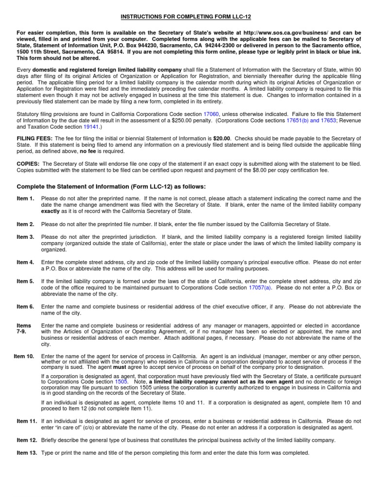CA Statement of Information Corp Form LLC12 Service Of Process