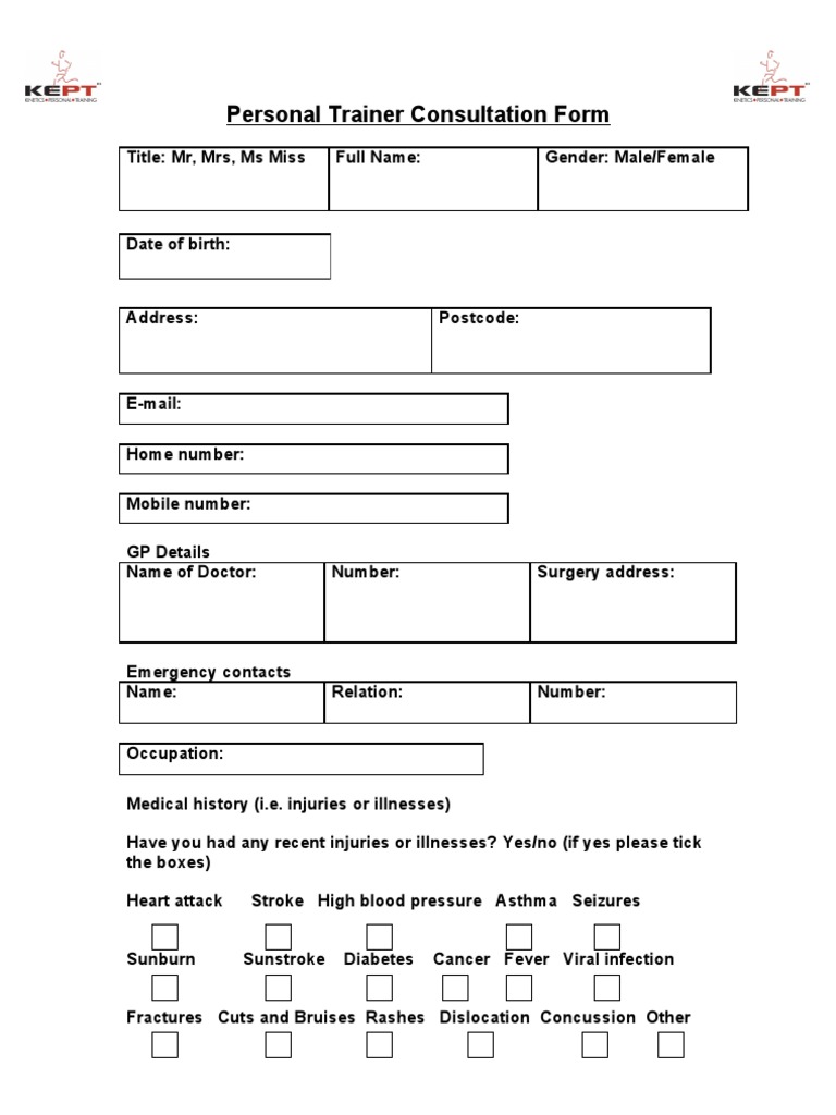 Personal Trainer Consultation Form PDF Health Care Public Health