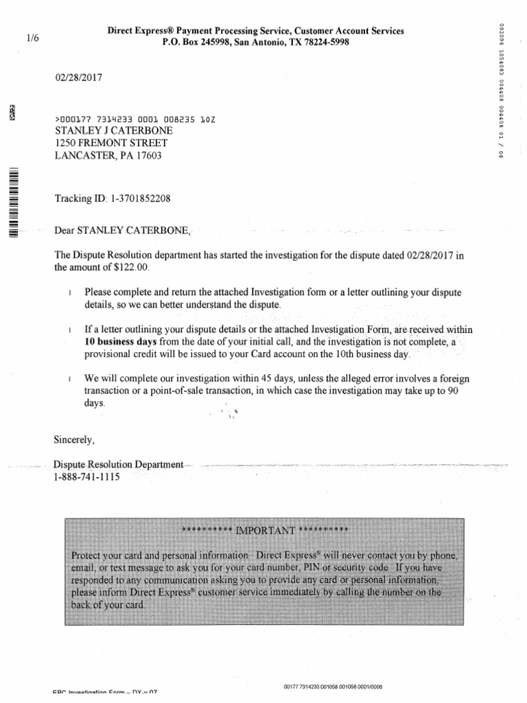 DIRECT EXPRESS DISPUTE RESOLUTION FORM COMPLAINT ID No. 13701852208