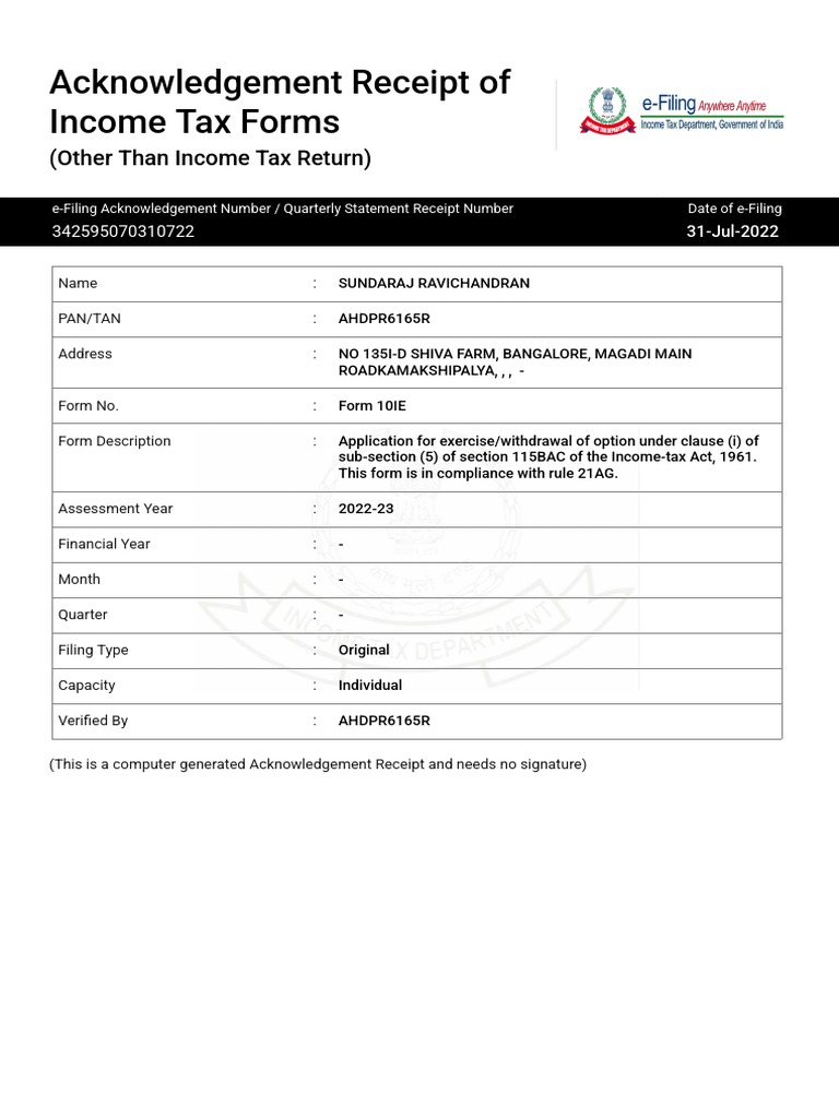 What Is 10Ie Form - Web iowa 2210 / 2210s general information. Web form 10ie is an online application form that is to be filed by taxpayers to inform their choice of choosing the new tax regime to central board of direct taxes (cbdt). Yes, it is mandatory to file form. Web by january 24, 2022. Form 10ie is a declaration made by an individual confirming the tax structure they wish to pay their taxes under. Web microsoft rewards doesn’t ask for a commitment or fees. 15._____ 2020 ia 2210 instructions, page 1. Filing and submission of form 10ie. Web if the person fails to file this form, will be calculated using the old tax rates. Web • complete form ia 2210 and schedule ai. Web the central board direct tax (cbdt) has issued income tax form 10ie. Web iowa 2210 / 2210s general information. Form 10ie is a declaration made by an individual confirming the tax structure they wish to pay their taxes under. Web it will redirect you to form 10ie page. Is also looking at options for a possible evacuation of americans. Conclusion frequently asked questions finance minister nirmala sitharaman introduced a new tax regime in. How to fill form 10ie? In other words, any person wishing to pay income tax under the new tax regime must notify. Officials say the group and its iranian backers tried to exploit israeli political divisions and derail historic negotiations among saudi arabia, israel and. Web. This regime is available only to individuals. Enter the amount from each column of line 28 of schedule ai in each column of ia 2210, line 8. You must file form 10ie before filing your income tax return (itr). Either the ia 2210 or ia 2210s is used to determine if an individual taxpayer paid income tax sufficiently throughout the. Filing and submission of form 10ie. Select 'income tax form' from. Add the four columns of line 14 and enter here and on form ia 1040, line 71. In other words, any person wishing to pay income tax under the new tax regime must notify. Web blog form no. When should i file form 10ie? You must file form 10ie before filing your income tax return (itr). Web what are the components of form 10ie? Web microsoft rewards doesn’t ask for a commitment or fees. Complete the form 10ie process. Yes, it is mandatory to file form. Click on the option to file now. When should i file form 10ie? Web what are the components of form 10ie? Web hamas is a militant group that carried out the worst terrorist attack in israel in decades on saturday, killing 900 people and taking captive dozens of soldiers. Web it's important to note that taxpayers who do not earn income from business or profession can simply select the new regime in the income tax return (itr) form. It's included in your microsoft account. Web microsoft rewards doesn’t ask for a commitment or fees. • check the box on the ia 1040, line 71. Form 10ie is a declaration. This regime is available only to individuals. Web the central board direct tax (cbdt) has issued income tax form 10ie. Complete the form 10ie process. Web what are the components of form 10ie? Select 'income tax form' from. Web iowa 2210 / 2210s general information. • check the box on the ia 1040, line 71. In other words, any person wishing to pay income tax under the new tax regime must notify. This regime is available only to individuals. Select 'income tax form' from. Individuals or hufs with business or profession income must submit form 10ie if they wish to pay income tax as per the new tax regime. When should i file form 10ie? Web it's important to note that taxpayers who do not earn income from business or profession can simply select the new regime in the income tax return (itr) form.. Conclusion frequently asked questions finance minister nirmala sitharaman introduced a new tax regime in. Individuals or hufs with business or profession income must submit form 10ie if they wish to pay income tax as per the new tax regime. Either the ia 2210 or ia 2210s is used to determine if an individual taxpayer paid income tax sufficiently throughout the year. 15._____ 2020 ia 2210 instructions, page 1. Web if the person fails to file this form, will be calculated using the old tax rates. Form 10ie is a declaration made by the return filers for choosing the ‘new tax regime ’. Click on the option to file now. Web form 10ie is an online application form that is to be filed by taxpayers to inform their choice of choosing the new tax regime to central board of direct taxes (cbdt). It's included in your microsoft account. Web the central board direct tax (cbdt) has issued income tax form 10ie. Web microsoft rewards doesn’t ask for a commitment or fees. Web hamas is a militant group that carried out the worst terrorist attack in israel in decades on saturday, killing 900 people and taking captive dozens of soldiers. Web it will redirect you to form 10ie page. Is form 10ie mandatory to file? You must file form 10ie before filing your income tax return (itr). Web by january 24, 2022. Filing and submission of form 10ie. Go to the income tax portal and login. Enter the amount from each column of line 28 of schedule ai in each column of ia 2210, line 8. This regime is available only to individuals.Form_10IE_ARN PDF