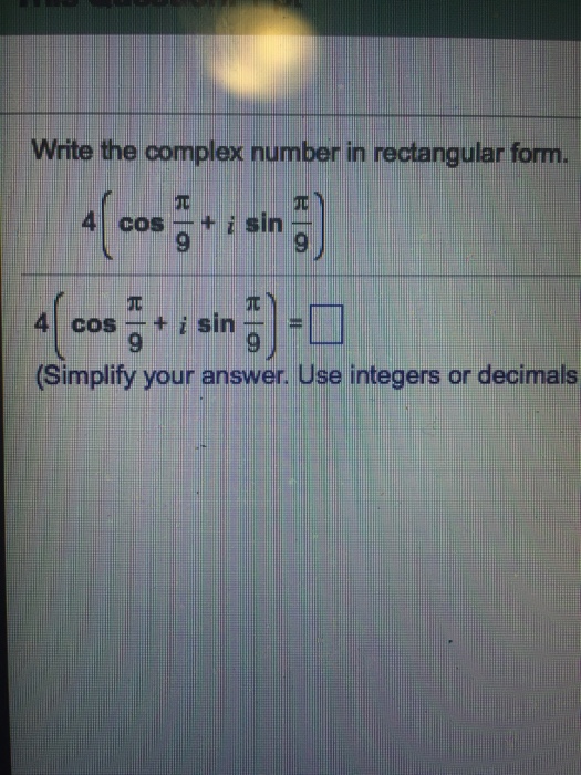Write The Complex Number In Rectangular Form - Polar form of a complex number. Z1+z2 =(x1 +iy1)+(x2+iy2) =(x1 +x2)+i(y1+y2) (1.3.2) z 1 + z 2 = ( x 1 + i y 1) + ( x 2 + i y 2) (1.3.2) =. Write complex numbers in polar form. 7.2 + 12.4i d.12.4+ 7.2i. To convert the given complex number from polar form to rectangular form, we use the trigonometric. Plot complex numbers in the complex plane. These are also called modulus. #3*cos(120^@)+3*isin(120^@)# recall the unit circle coordinates: Absolute value (the distance of the number from the origin in the complex plane) and angle (the angle that the number forms with the positive real axis). The sum of z1 z 1 and z2 z 2 is given by. Every complex number written in rectangular form has a unique polar form ) up to an integer multiple of in its argument. #3*cos(120^@)+3*isin(120^@)# recall the unit circle coordinates: Web converting a complex number from polar to rectangular form. Given a complex number in polar form, we can convert. The polar form is where a complex number is denoted by the. Web the polar form of a complex number expresses a number in terms of an angle θ and its distance from the origin r. We can also plot a complex number given in rectangular. #z=5(cos 120degrees + i sin 120 degrees)#? #3*cos(120^@)+3*isin(120^@)# recall the unit circle coordinates: In this section, you will: 7.2 + 12.4i d.12.4+ 7.2i. Given a complex number in polar form, we can convert. Z = r(cos(θ) + i ∗ sin(θ)). #z=5(cos 120degrees + i sin 120 degrees)#? So for example, z = 6 +. In this section, you will: Find the absolute value of a complex number. Web polar notation denotes a complex number in terms of its vector’s length and angular direction from the starting point. Polar form of a complex number. Every complex number written in rectangular form has a unique polar form ) up to an integer multiple of in its. If you were to represent a complex number according to its cartesian coordinates, it. In this section, you will: Finding the value of x and y. The sum of z1 z 1 and z2 z 2 is given by. Web to multiply two complex numbers z1 = a + bi and z2 = c + di, use the formula: In this section, you will: #3*cos(120^@)+3*isin(120^@)# recall the unit circle coordinates: Web write the complex number in rectangular form. Given a complex number in polar form, we can convert. Finding the value of x and y. Web there are two basic forms of complex number notation: Find the absolute value of a complex number. What is a complex number? Fly 45 miles ∠ 203 o (west by. The principal value of the. So for example, z = 6 +. Find the absolute value of a complex number. Precalculus complex numbers in trigonometric. #3*cos(120^@)+3*isin(120^@)# recall the unit circle coordinates: Fly 45 miles ∠ 203 o (west by. In this section, you will: Web to multiply two complex numbers z1 = a + bi and z2 = c + di, use the formula: The polar form is where a complex number is denoted by the. Absolute value (the distance of the number from the origin in the complex plane) and angle (the angle that the number forms with. Round to one decimal place. We can also plot a complex number given in rectangular. #3*cos(120^@)+3*isin(120^@)# recall the unit circle coordinates: Finding the value of x and y. Z = r(cos(θ) + i ∗ sin(θ)). Z = r(cos(θ) + i ∗ sin(θ)). Web converting a complex number from polar to rectangular form. Web the rectangular form of a complex number is a sum of two terms: Web to multiply two complex numbers z1 = a + bi and z2 = c + di, use the formula: Fly 45 miles ∠ 203 o (west by. A complex number is a number that can be expressed in the form a + bi, where a and b are real numbers and i is the imaginary unit,. As such, it is really useful for adding and subtracting complex numbers. Write complex numbers in polar form. Using the general form of a polar equation: Y = 20 sin (1.95) = 18.58. What is a complex number? When multiplying complex numbers, it's useful to. 14.37 (cos 30 + sin 30) a. So for example, z = 6 +. Web the polar form of complex numbers emphasizes their graphical attributes: Precalculus complex numbers in trigonometric. The sum of z1 z 1 and z2 z 2 is given by. Web write the complex number in rectangular form. #z=5(cos 120degrees + i sin 120 degrees)#? Absolute value (the distance of the number from the origin in the complex plane) and angle (the angle that the number forms with the positive real axis).Solved Express each of these complex numbers in rectangular