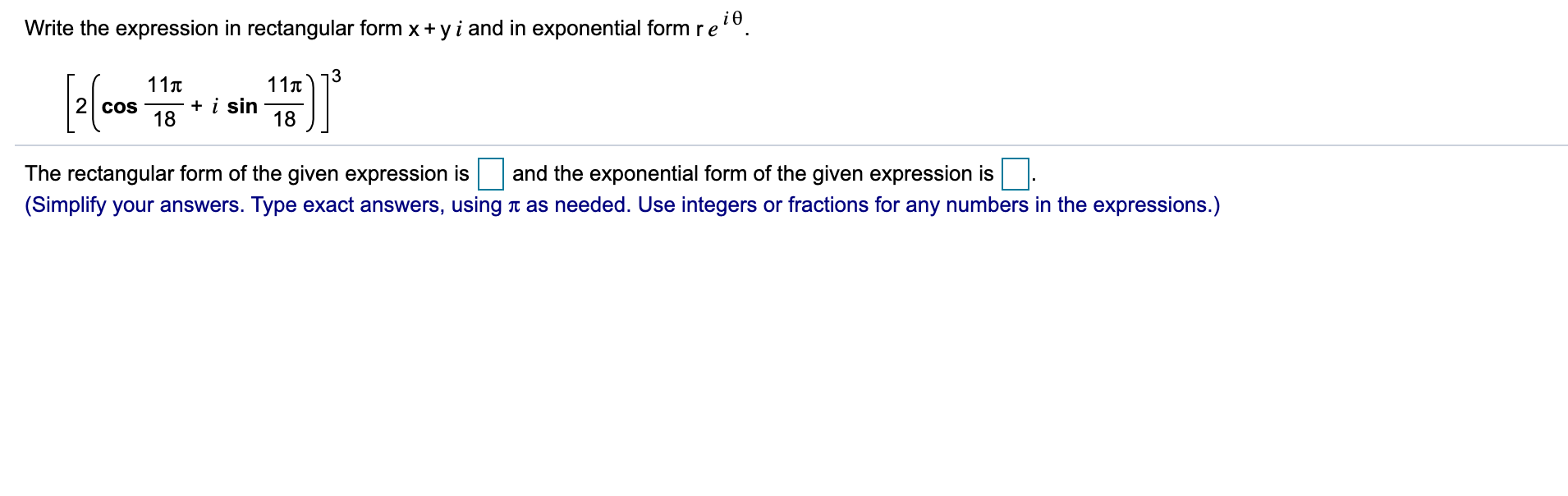 Write The Expression In Rectangular Form And In Exponential Form - Write the expression in rectangular form x+yi and in exponential form re iθ. Thus, the exponential form is 256e⁰. (−1−i) ⁹ the rectangular form of the given expression is and. Write the expression in rectangular form, x + y i, and in exponential form, re reio. Web write the expression in rectangular form, x + and in exponential form, [ e [s( cos 36 sin 36 the rectangular form of the given expression is and the exponent. ( 13 − i) 4 the rectangular form of the given expression is ?,. The given expression is 2(cos(8/3π) +. Web math trigonometry trigonometry questions and answers write the expression in rectangular form, x+yi and in exponential form, re' [v5 (cos * i sin ) the rectangular. 3n +i sin 8 cos the rectangular form of the given expression is. John’s school vs osei tutu shs vs opoku ware school Write the expression in rectangular form, x + y i, and in exponential form, re reio. 3n +i sin 8 cos the rectangular form of the given expression is. Web question write the expression in rectangular form, x+yi, and in exponential form, r e i theta. Write the expression in rectangular form, x +yi, and in exponential form, reiθ. Thus,. Write the expression in rectangular form x+yi and in exponential form re iθ. [4(cos 103π +isin 103π)]5 the rectangular form of the given expression is and. X1 3 y 1 3 x 1 3 y 1 3. Web an exponential equation is an equation that contains an exponential expression of the form b^x, where b is a constant (called the. Web the rectangular form of the given expression is 16(cos(2/3π) + isin(2/3π)), and the exponential form is 16e^(i(2/3π)). [4(cos 103π +isin 103π)]5 the rectangular form of the given expression is and. X1 3 y 1 3 x 1 3 y 1 3. Write the expression in rectangular form, x +yi, and in exponential form, reiθ. Web therefore, the rectangular form. Web therefore, the rectangular form becomes 64(1 + 0i) = 64. The given expression is 2(cos(8/3π) +. Web write the expression in rectangular form, x + and in exponential form, [ e [s( cos 36 sin 36 the rectangular form of the given expression is and the exponent. John’s school vs osei tutu shs vs opoku ware school Web the. X1 3 y 1 3 x 1 3 y 1 3. The given expression is 2(cos(8/3π) +. 3n +i sin 8 cos the rectangular form of the given expression is. [4(cos 103π +isin 103π)]5 the rectangular form of the given expression is and. Thus, the exponential form is 256e⁰. (−1−i) ⁹ the rectangular form of the given expression is and. 3n +i sin 8 cos the rectangular form of the given expression is. Web answer answered write the expression in rectangular form, x+yi, and in exponential form, reᶦθ. Write the expression in rectangular form, x +yi, and in exponential form, reiθ. Web in exponential form, we can write 256. [2(cos92π+isinθ2π)]3 the rectangular form of the given expression is and the. X1 3 y 1 3 x 1 3 y 1 3. [4(cos 103π +isin 103π)]5 the rectangular form of the given expression is and. Write the expression in rectangular form, x +yi, and in exponential form, reiθ. Write the expression in rectangular form, x +yi, and in exponential form,. Write the expression in rectangular form x+yi and in exponential form re iθ. Web answer answered write the expression in rectangular form, x+yi, and in exponential form, reᶦθ. The exponential form of the given expression is 112.99999999999999e^. (−1−i) ⁹ the rectangular form of the given expression is and. Web therefore, the rectangular form becomes 64(1 + 0i) = 64. Web therefore, the rectangular form becomes 64(1 + 0i) = 64. X1 3 y 1 3 x 1 3 y 1 3. Web exponential expressions and equations. Write the expression in rectangular form, x + y i, and in exponential form, re reio. Write the expression in rectangular form x+yi and in exponential form re iθ. [2(cos 10π +isin 10π)]5 the rectangular form of the given. Write the expression in rectangular form, x +yi, and in exponential form, reiθ. [2(cos92π+isinθ2π)]3 the rectangular form of the given expression is and the. 3n +i sin 8 cos the rectangular form of the given expression is. Web an exponential equation is an equation that contains an exponential expression of. ( 13 − i) 4 the rectangular form of the given expression is ?,. Write the expression in rectangular form x+yi and in exponential form re iθ. Web the rectangular form of the given expression is 16(cos(2/3π) + isin(2/3π)), and the exponential form is 16e^(i(2/3π)). John’s school vs osei tutu shs vs opoku ware school Write the expression in rectangular form, x +yi, and in exponential form, reiθ. X1 3 y 1 3 x 1 3 y 1 3. Web in exponential form, we can write 256 as 256e⁰, where e represents euler's number. Web therefore, the rectangular form becomes 64(1 + 0i) = 64. [4(cos 103π +isin 103π)]5 the rectangular form of the given expression is and. Web write the expression in rectangular form, x + and in exponential form, [ e [s( cos 36 sin 36 the rectangular form of the given expression is and the exponent. Web exponential expressions and equations. [2(cos 10π +isin 10π)]5 the rectangular form of the given. In exponential form, we can use euler's formula, which states e^(ix) = cos(x) + isin(x). Write the expression in rectangular form, x +yi, and in exponential form, reiθ. Web answer answered write the expression in rectangular form, x+yi, and in exponential form, reᶦθ. Web question write the expression in rectangular form, x+yi, and in exponential form, r e i theta. Apply the rule xm n = n√xm x m n = x m n to rewrite the exponentiation as a radical. The exponential form can be. Use integers or decimals for. The given expression is 2(cos(8/3π) +.Solved Write the expression in rectangular form x + yi and